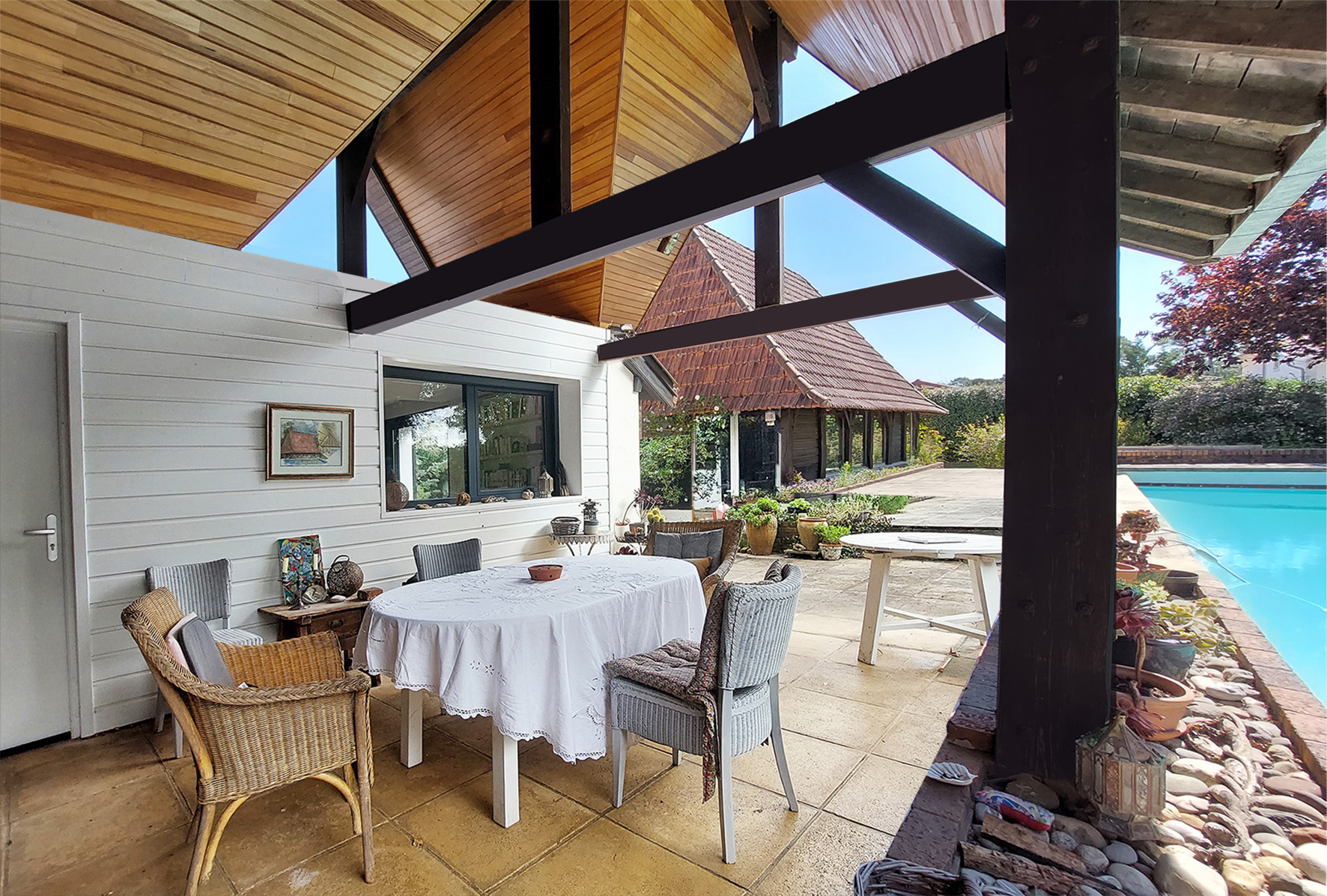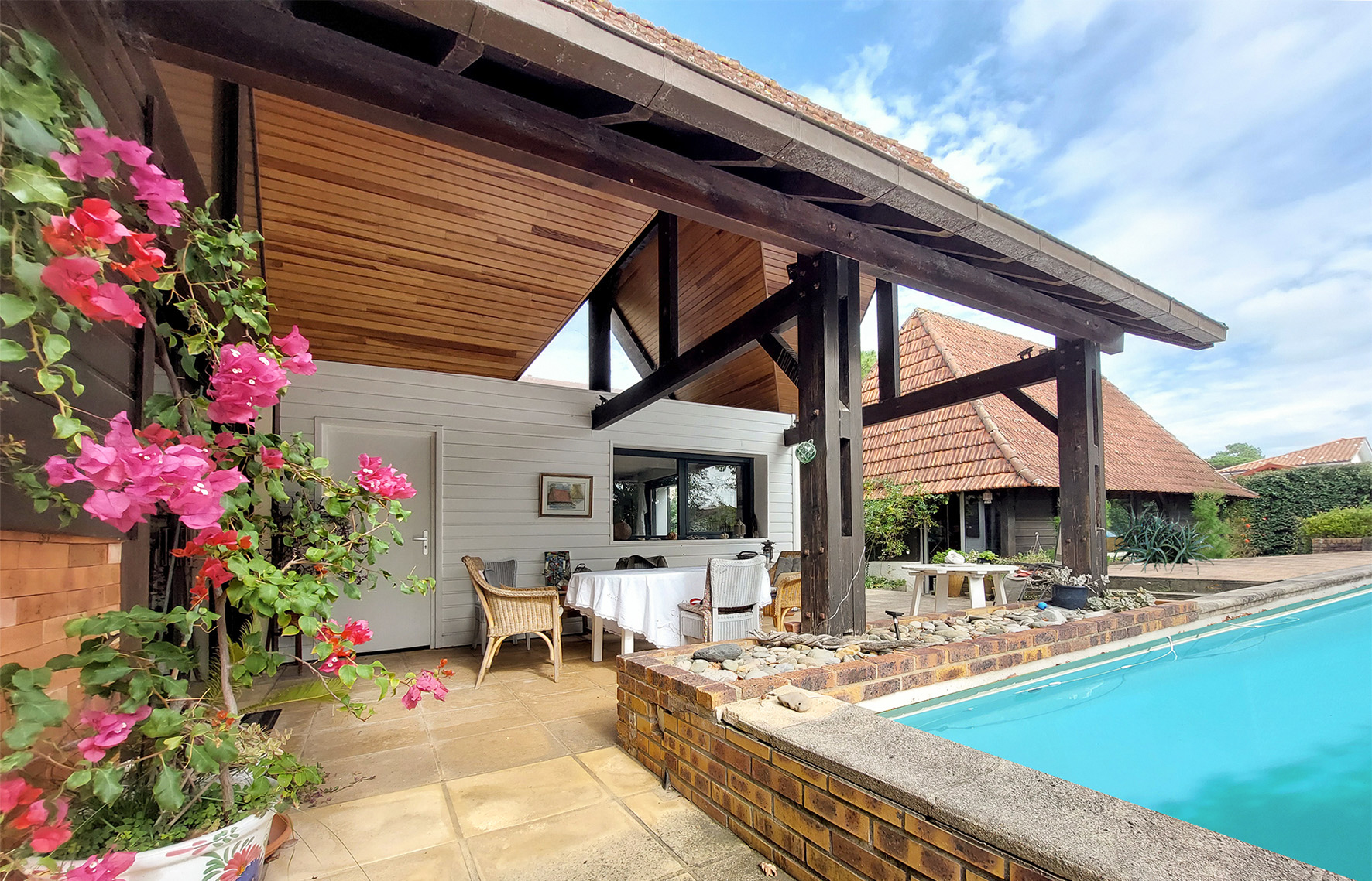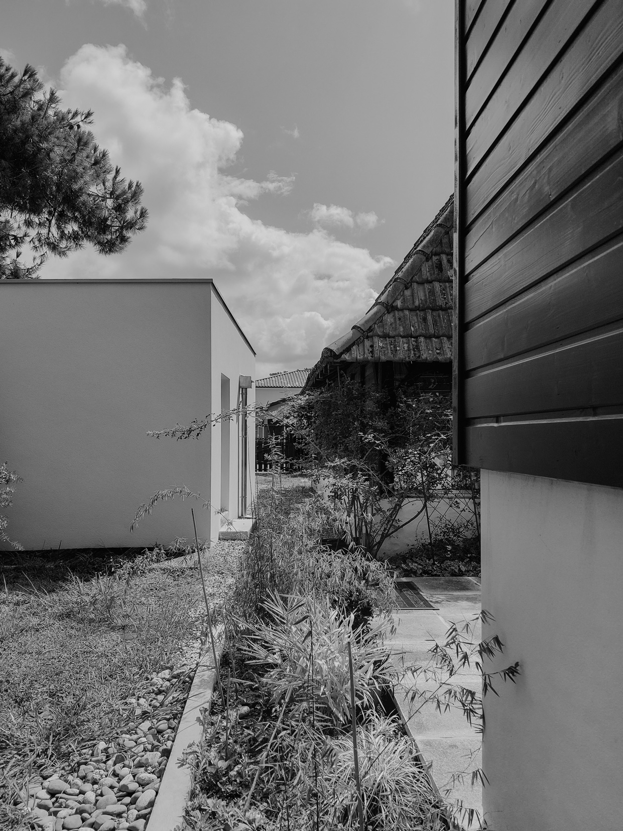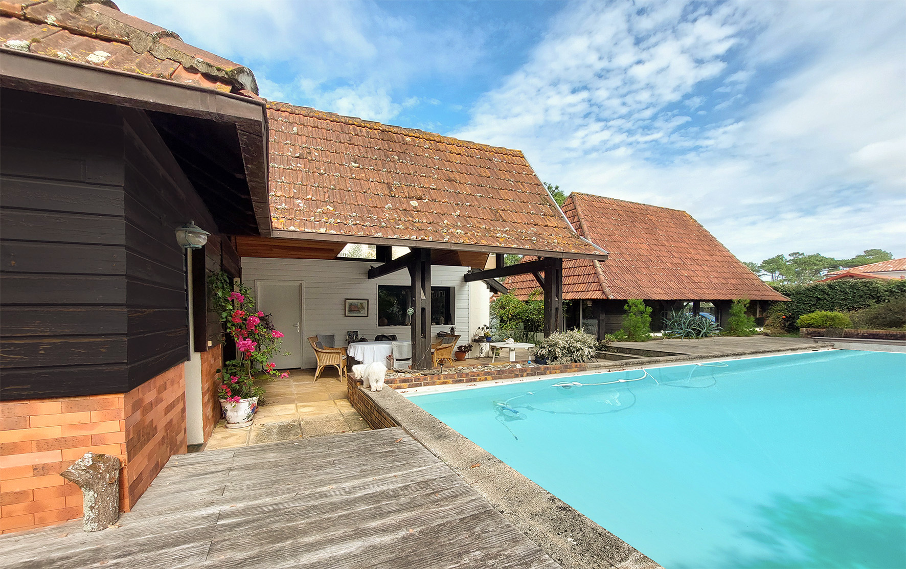 Au cœur d’un îlot urbain, cet ensemble atypique s’articule à la façon de l’airial landais autour d’une vaste piscine, d’une ancienne bergerie du 19ème siècle réhabilitée en salle de jeu en 1975, et d’une maison construite en 1991. Cette dernière reprend le style très marqué de la bergerie : grande toiture à « coyaux », à forte pente, ossature bois sur socle maçonné, et parement brique.