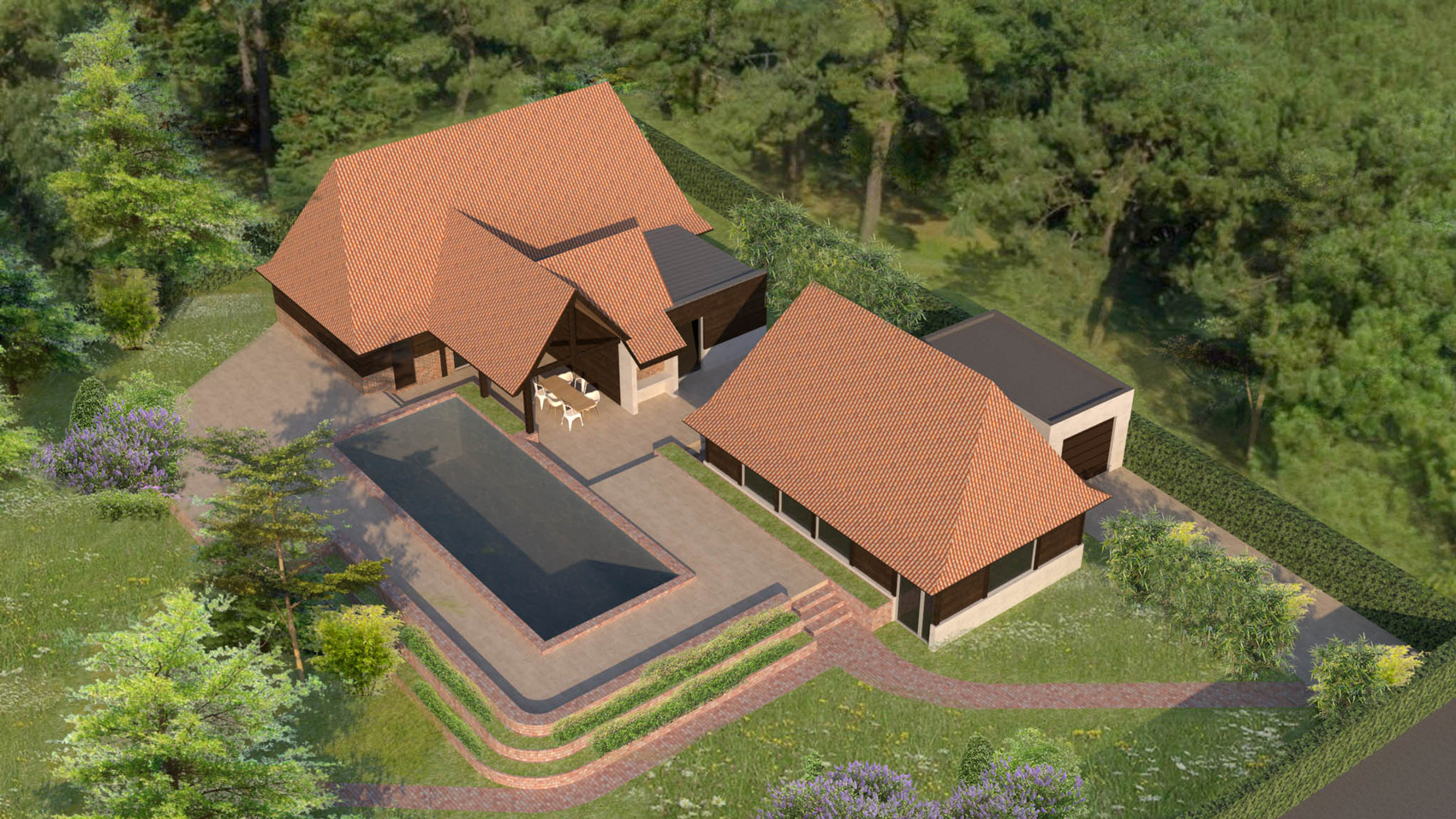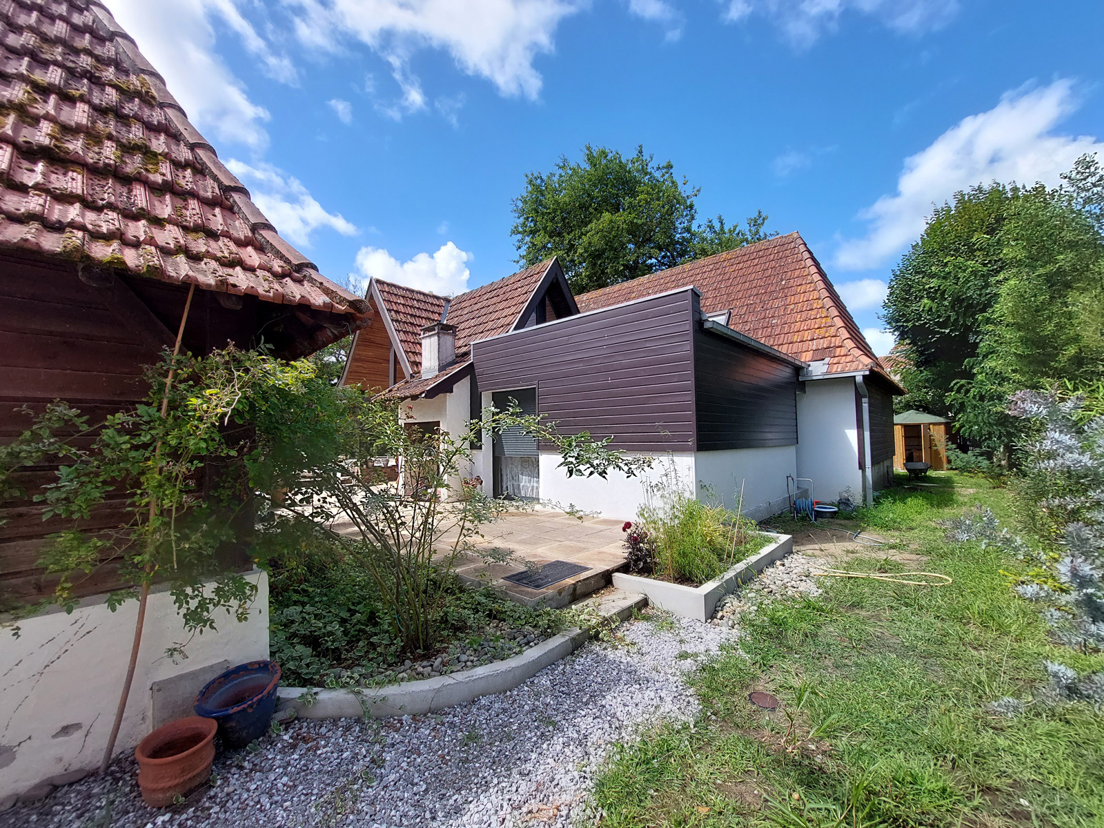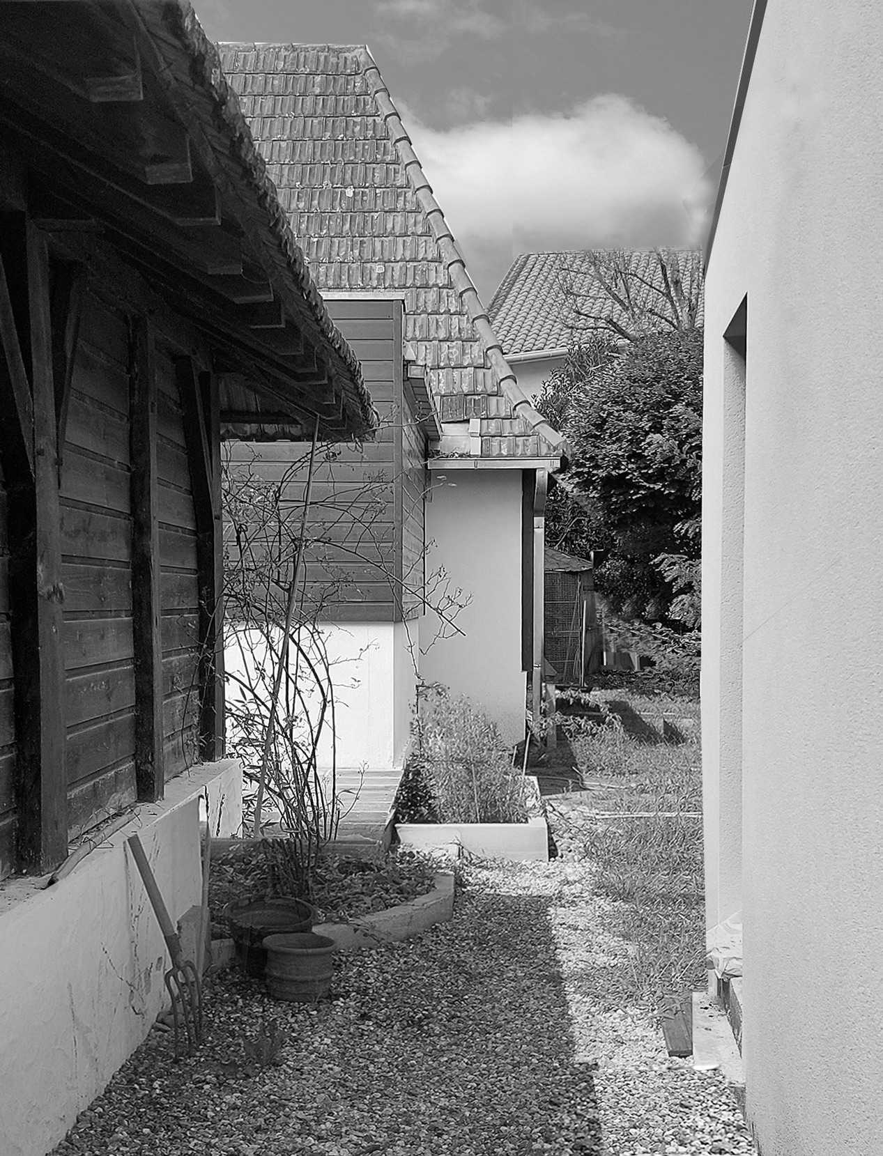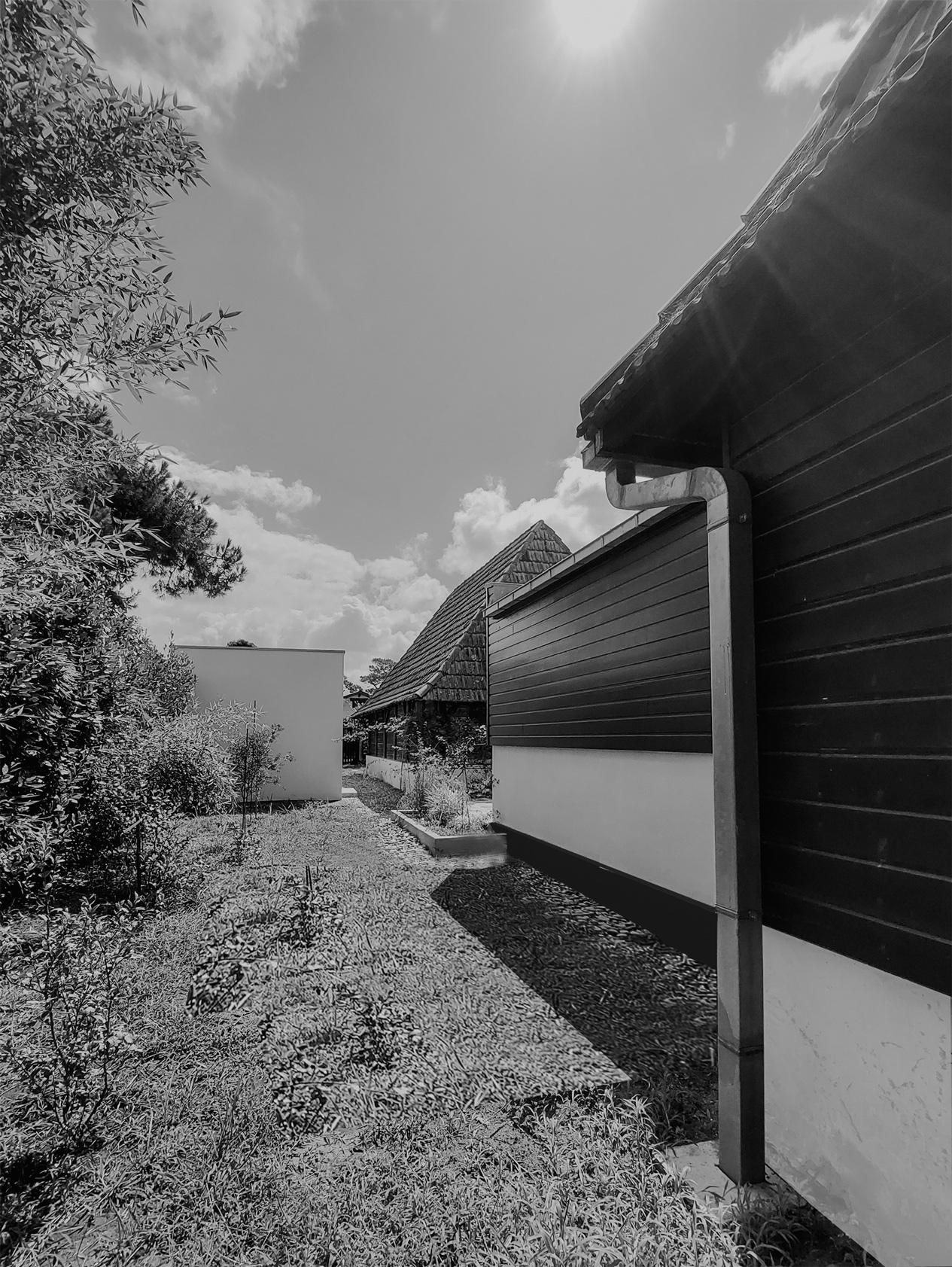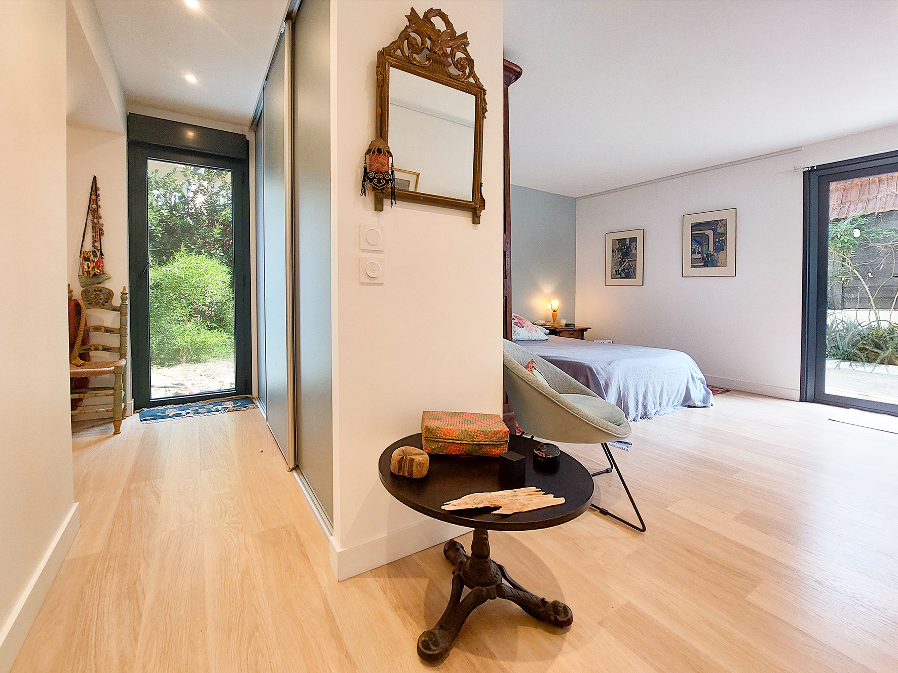 Au cœur d’un îlot urbain, cet ensemble atypique s’articule à la façon de l’airial landais autour d’une vaste piscine, d’une ancienne bergerie du 19ème siècle réhabilitée en salle de jeu en 1975, et d’une maison construite en 1991. Cette dernière reprend le style très marqué de la bergerie : grande toiture à « coyaux », à forte pente, ossature bois sur socle maçonné, et parement brique.