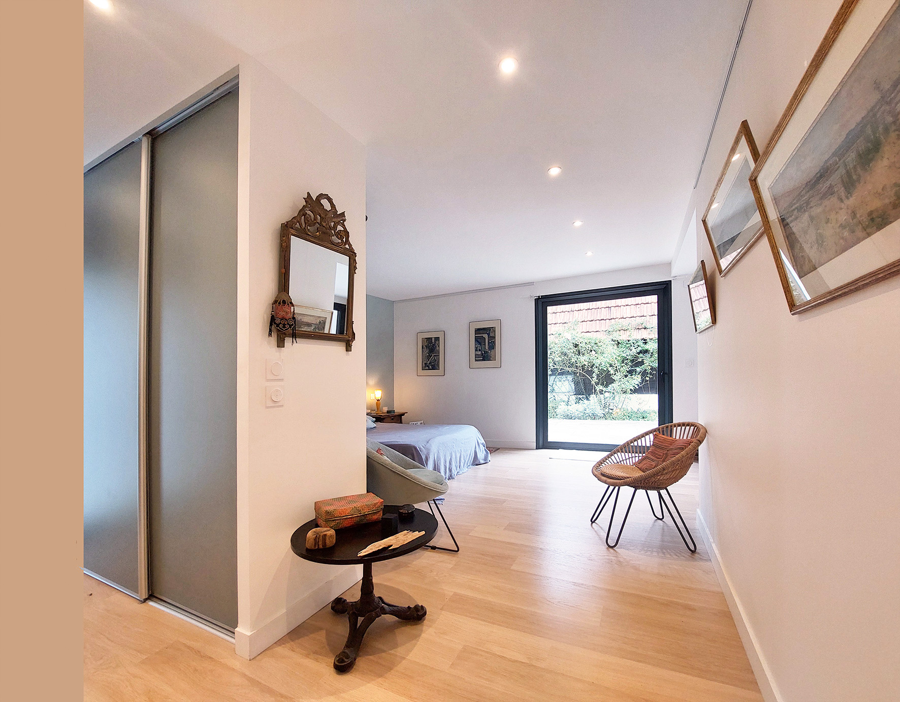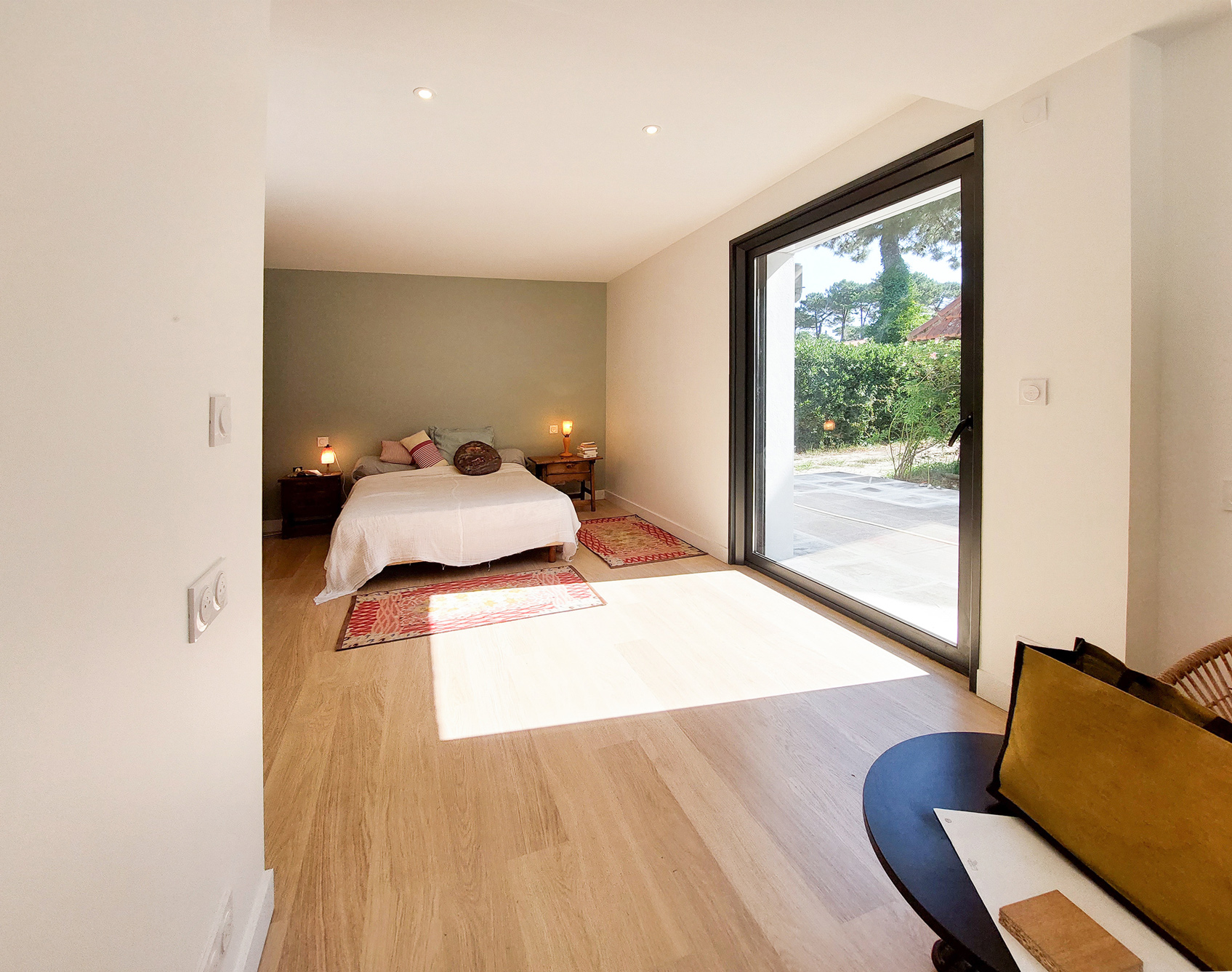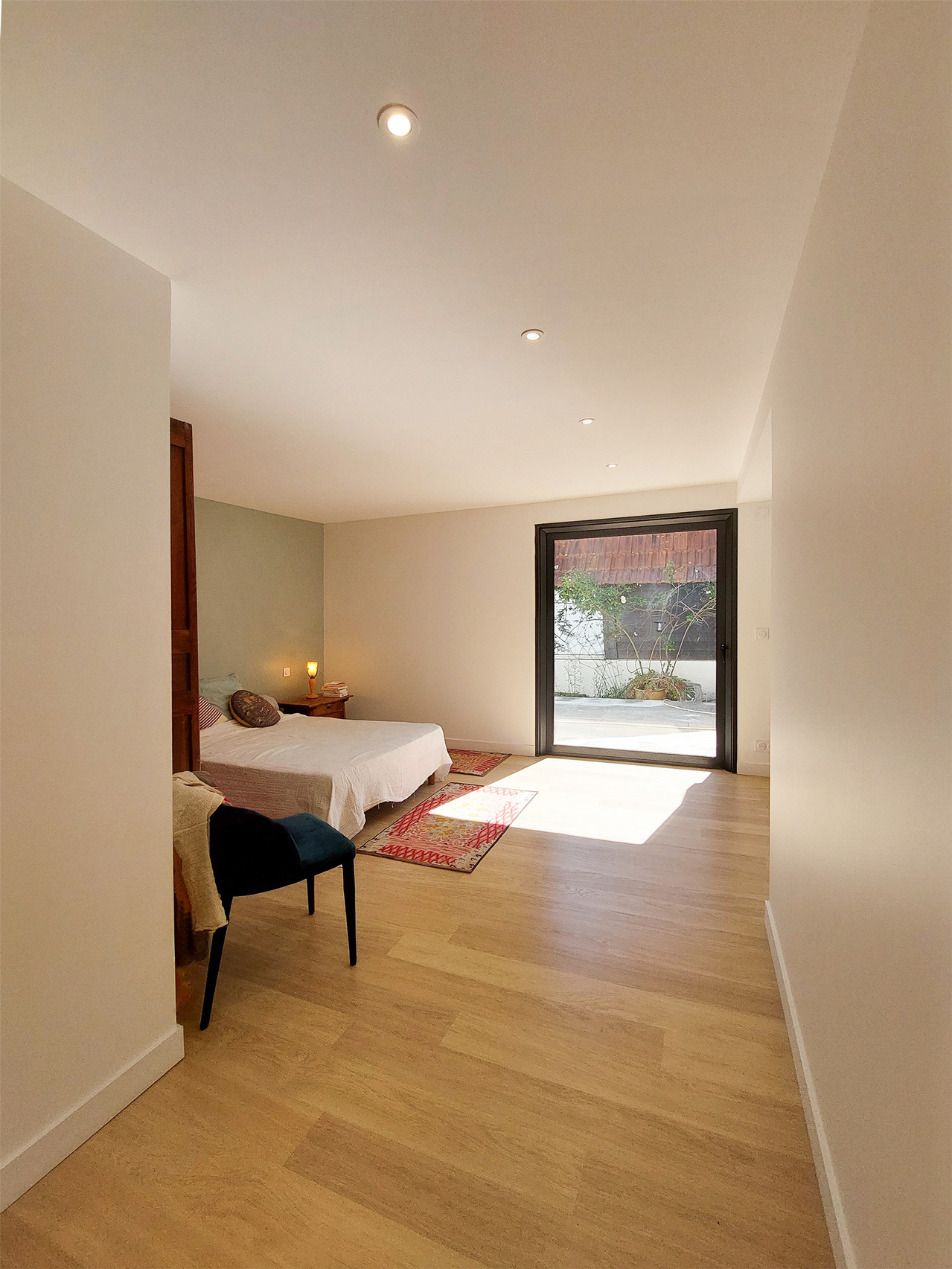 L’extension de la maison, s’insère dans un espace résiduel entre l’habitation, des locaux techniques et les sanitaires extérieurs, intégrés à la nouvelle chambre de 30m² bénéficiant ainsi d’une vue sur la piscine.