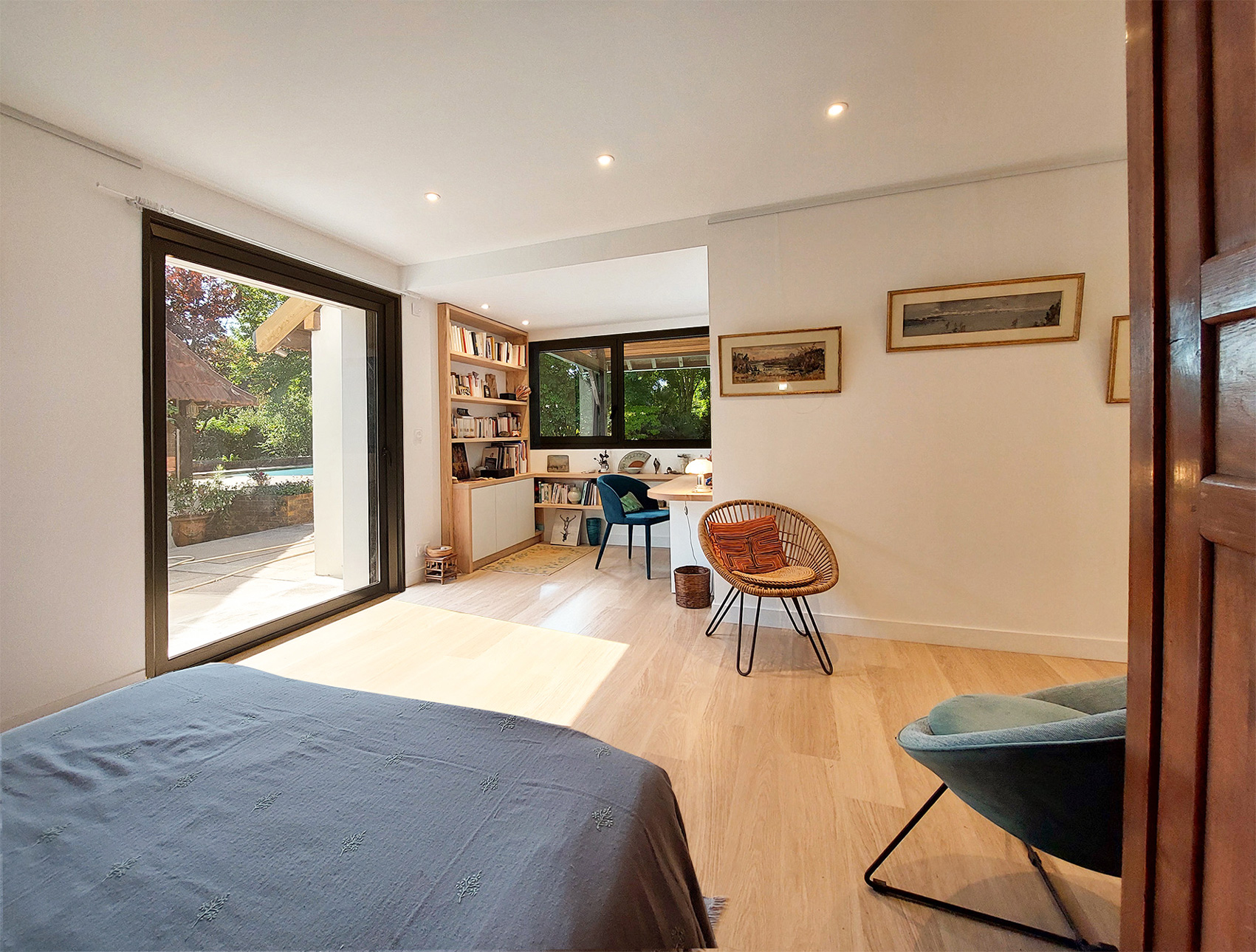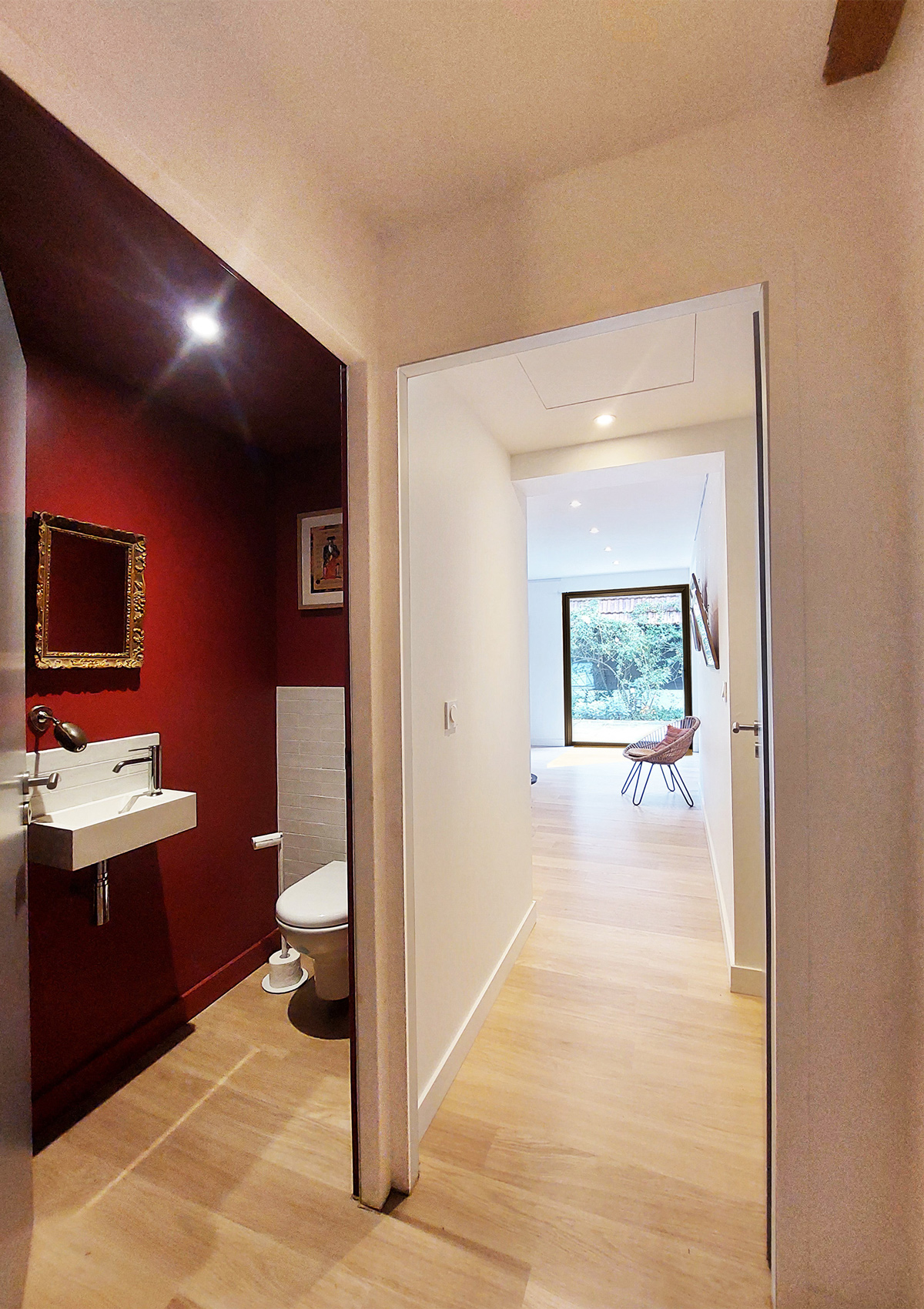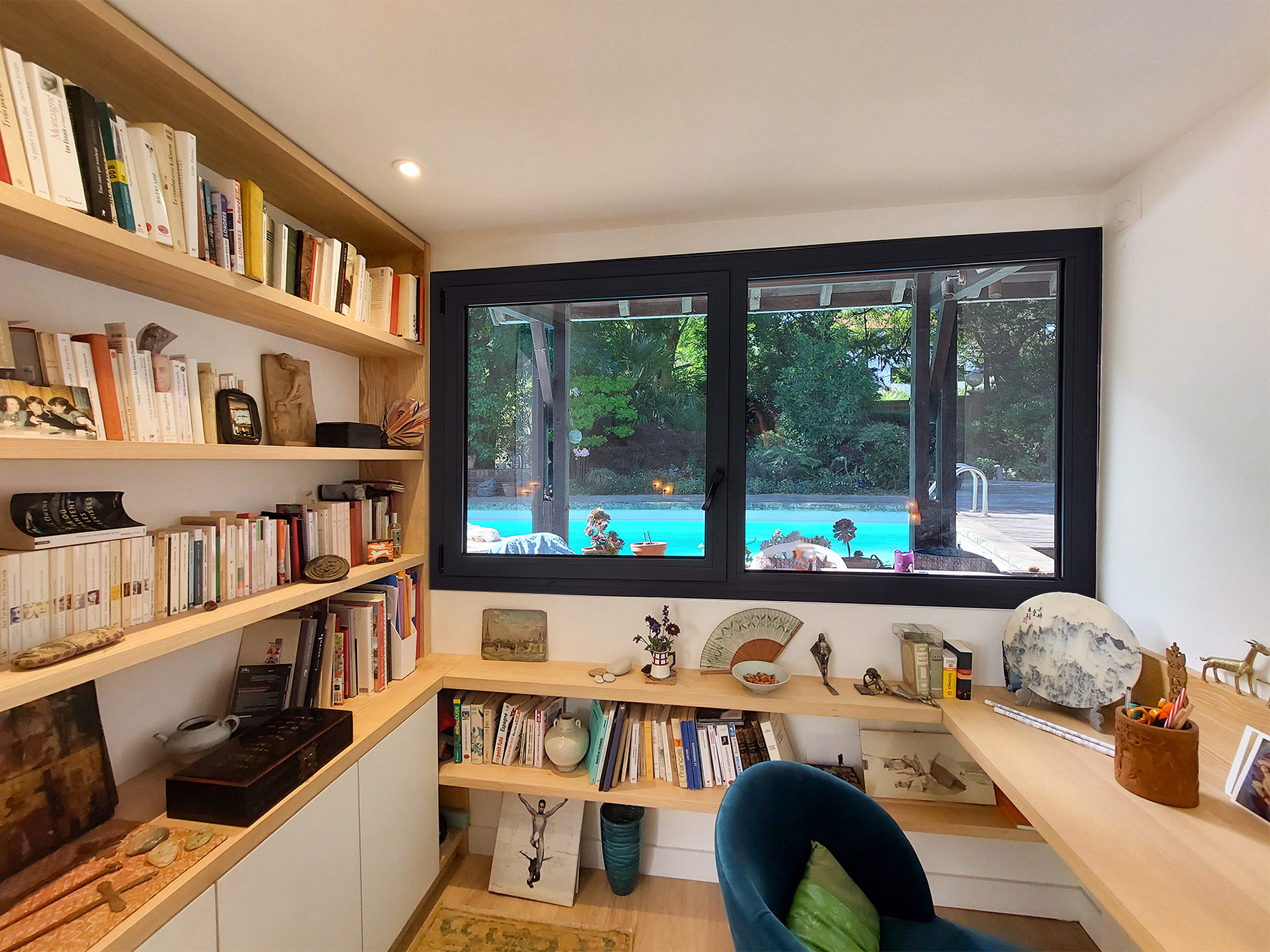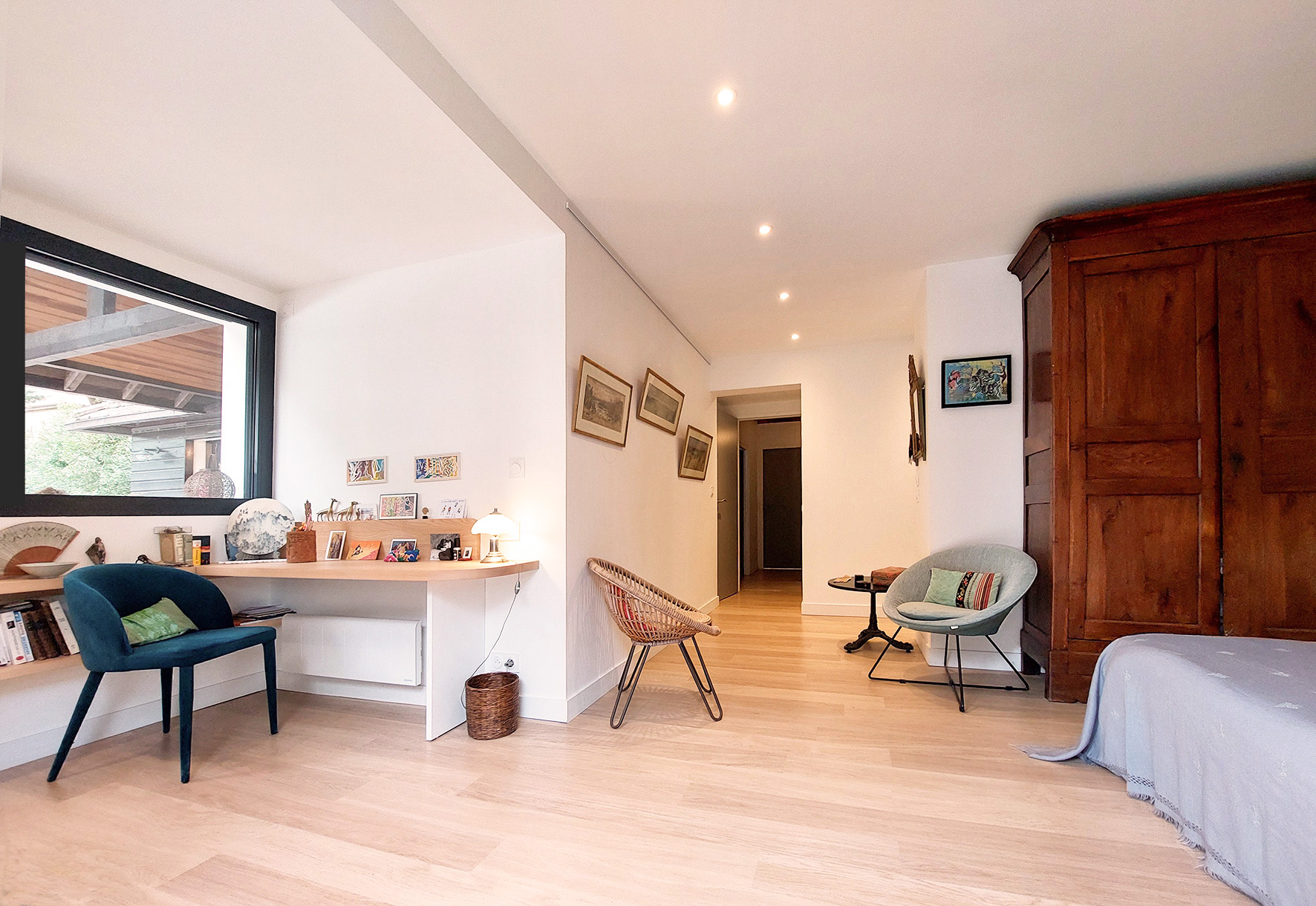 L’extension de la maison, s’insère dans un espace résiduel entre l’habitation, des locaux techniques et les sanitaires extérieurs, intégrés à la nouvelle chambre de 30m² bénéficiant ainsi d’une vue sur la piscine.