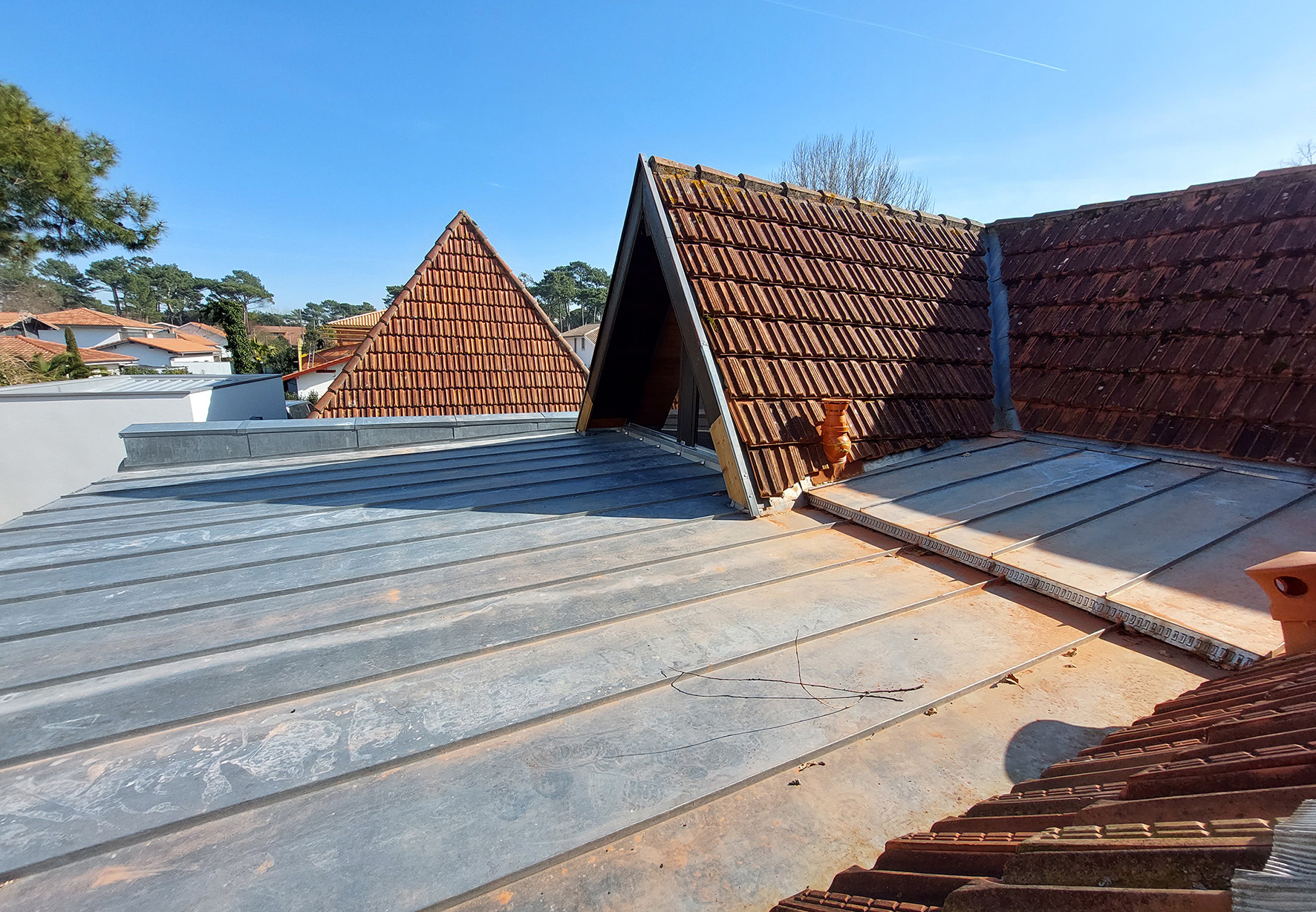 Malgré les contraintes techniques (réseaux enterrés, toitures enchevêtrées, gestion des eaux pluviales), une toiture en zinc à faible pente, sans acrotère côté chéneau, a permis une intégration harmonieuse tout en assurant une évacuation optimale de la pluie.