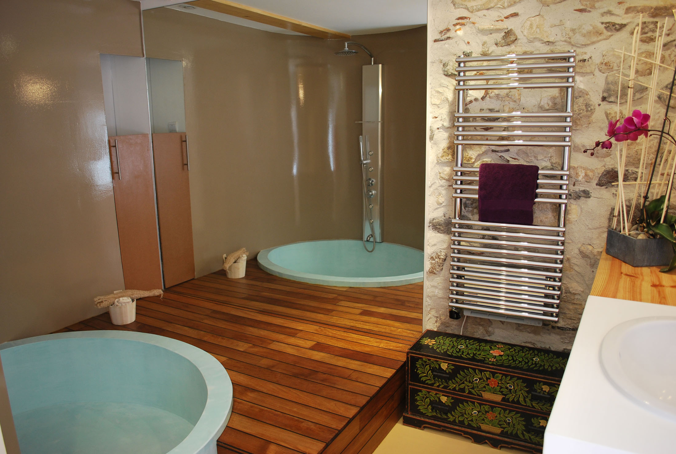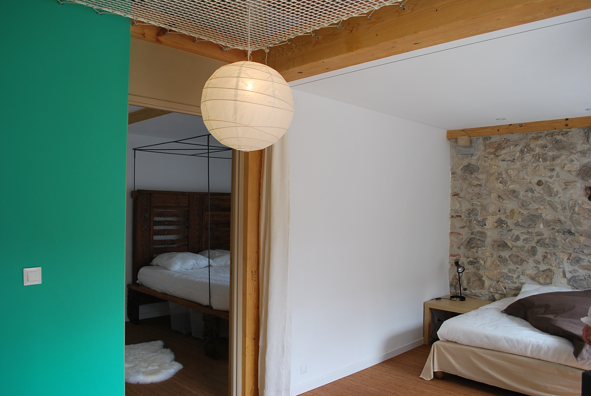 Les matériaux naturels utilisés (pierre, bois, bambou, rotin) s’harmonisent avec les murs de pierre existants enduits à la chaux ou laissés apparents.