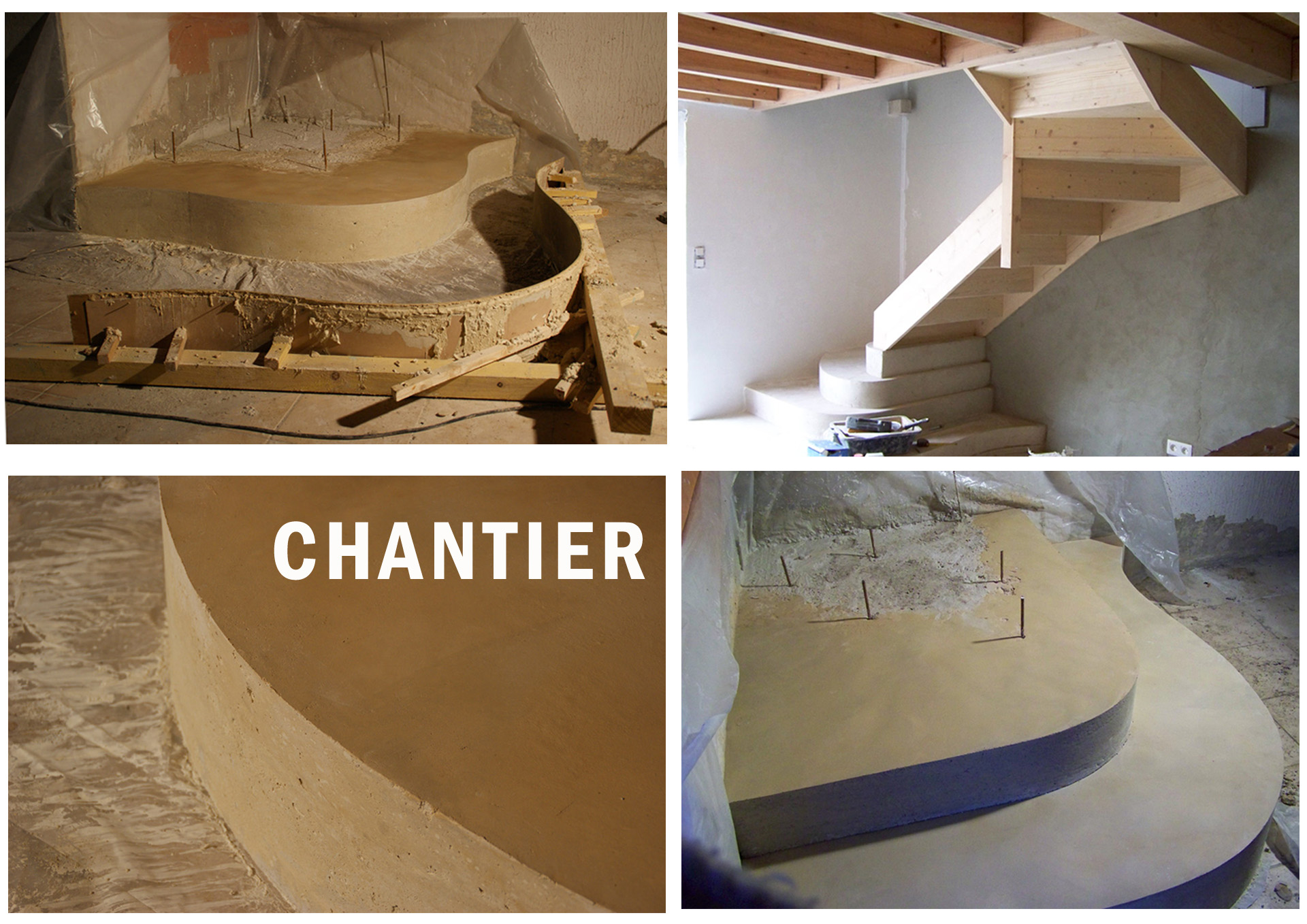 La réhabilitation a porté sur la création d’éléments aux proportions généreuses tels que la baignoire ovale et le socle de l’escalier en béton coulé teinté dans la masse.